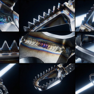 (1) Material. Our titanium footpegs are manufactured with high-grade Ti-6AL-4V titanium. This blend of titanium is lightweight, incredibly strong and corrosion-resistant. Each piece of the footpeg—from the bracket to the cross-section to the outer platform—is TIG-welded together. As a result, our footpegs have a factory look and are super strong.